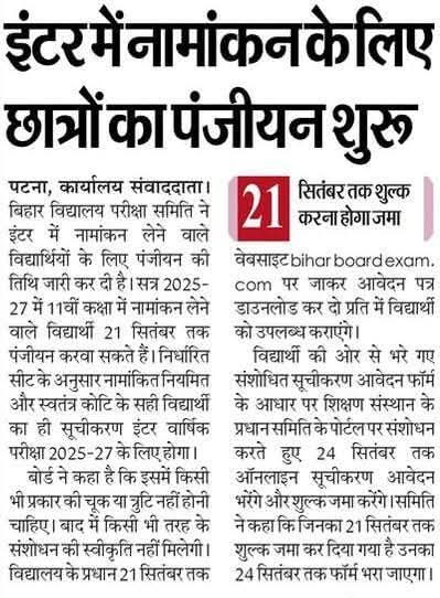 📰 इंटर में नामांकन के लिए पंजीयन शुरू – 21 सितम्बर तक करें रजिस्ट्रेशन 📰