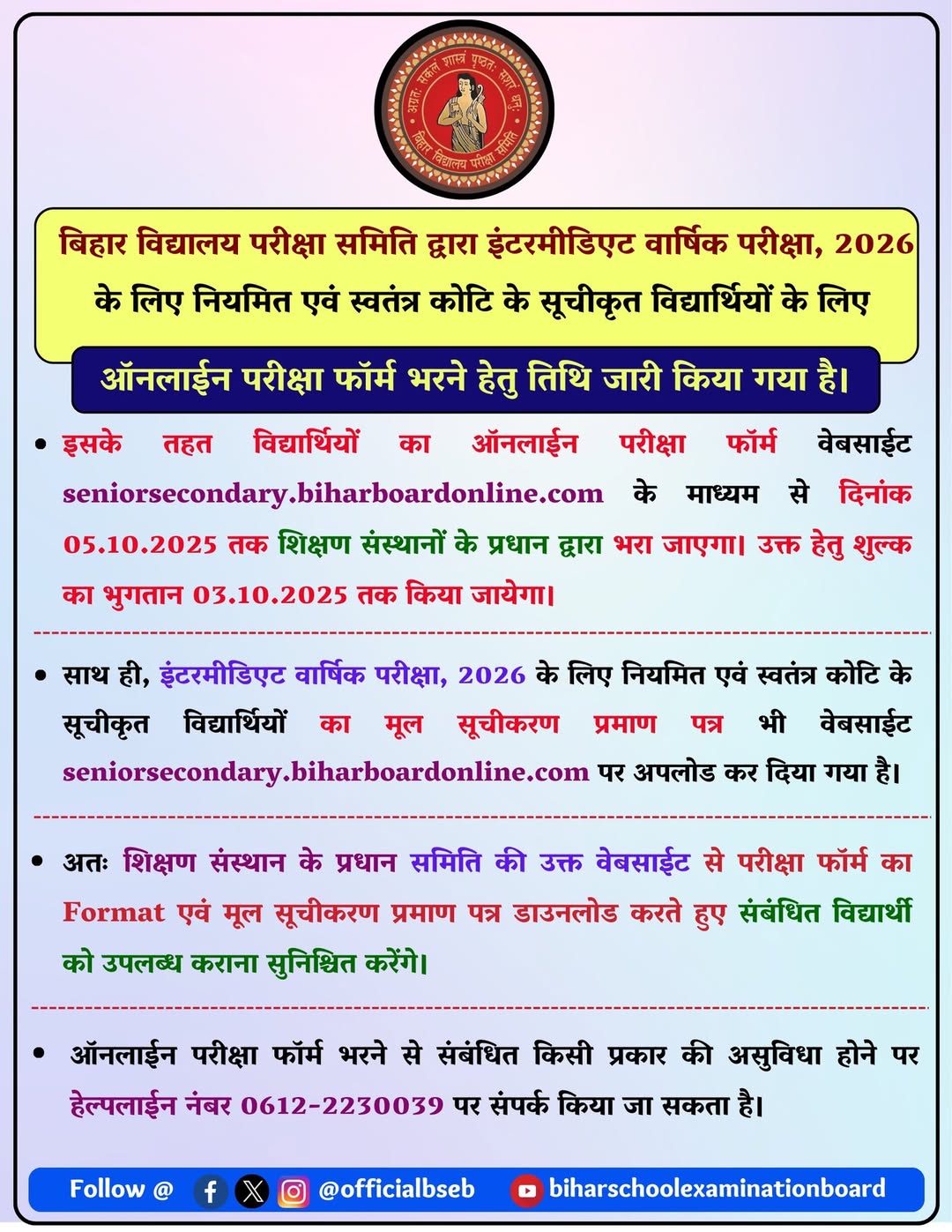 बिहार विद्यालय परीक्षा समिति द्वारा वार्षिक माध्यमिक परीक्षा, 2026 के लिए रजिस्ट्रेशन कराए हुए विद्यार्थियों के लिए ऑनलाईन परीक्षा फॉर्म भरने हेतु तिथि जारी किया गया है।
